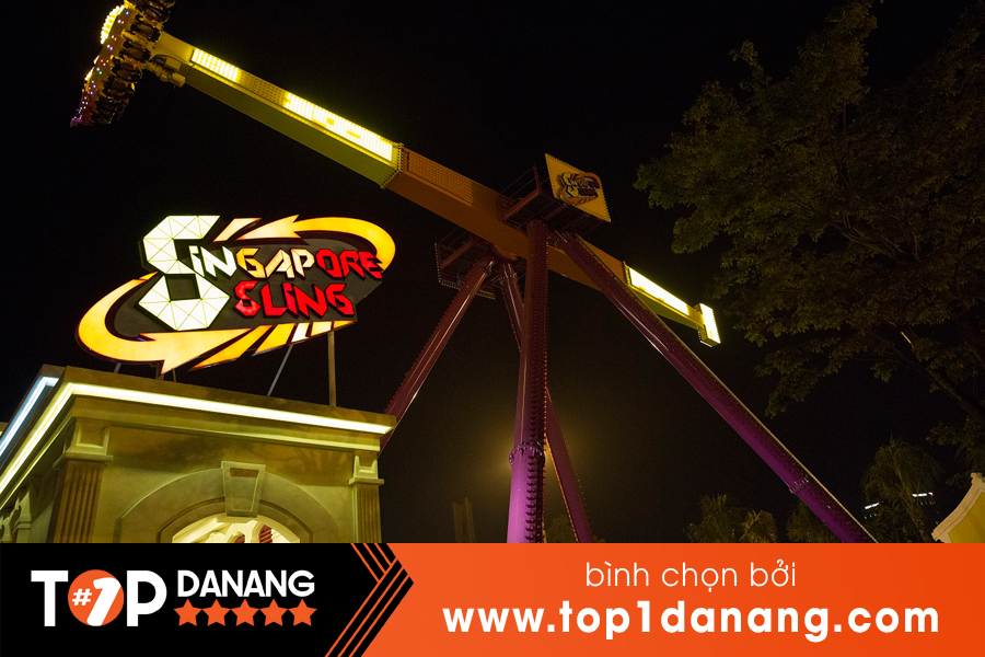 Sau khi quay tròn liên tục trong 5 phút, Singapore Sling đưa người chơi lên cao 31,5m, ở độ cao này bạn có thể ngắm nhìn toàn cảnh khu vui chơi trước khi trục xoay tròn 360 độ và rơi tự do với tốc độ 65km/giờ. Lưu ý du khách nào sợ độ cao hay có bệnh về tim mạch thì không nên tham gia trò chơi cảm giác mạnh này nhé.