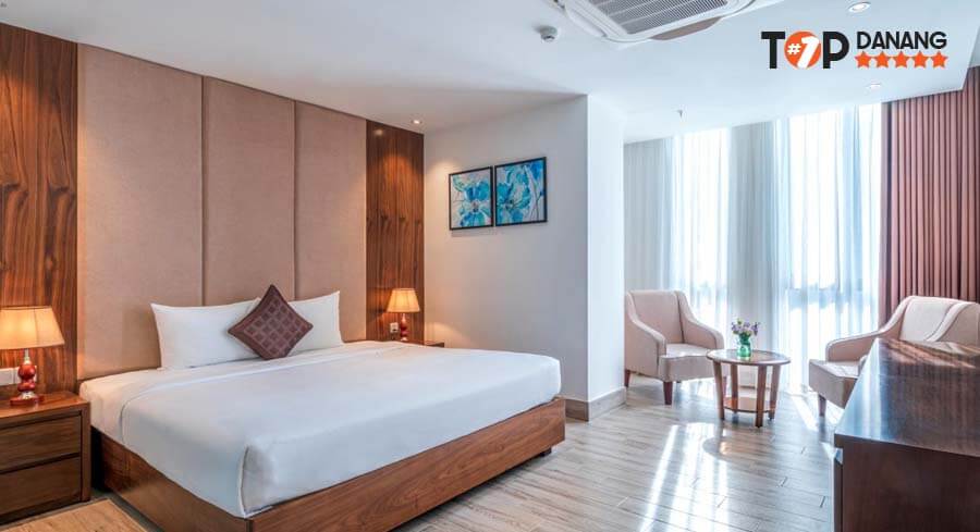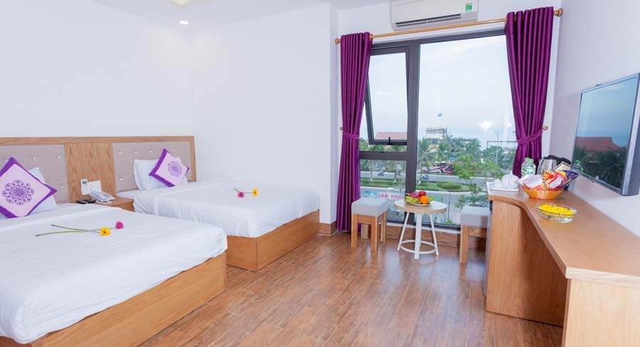 Không gian trong phòng thoáng mát, sạch sẽ, mỗi tầng đều có phòng có cửa sổ view hướng ra phía biển. Giúp du khách cảm nhận được vẻ đẹp của biển Đà Nẵng quyến rũ đến nhường nào. Đội ngũ nhân viên chuyên nghiệp được đào tạo bài bản, phong cách phục vụ tận tình, chu đáo. Làm cho du khách cảm nhận sự nhiệt tình và ấm áp tựa như đang sống tại chính ngôi nhà của mình.